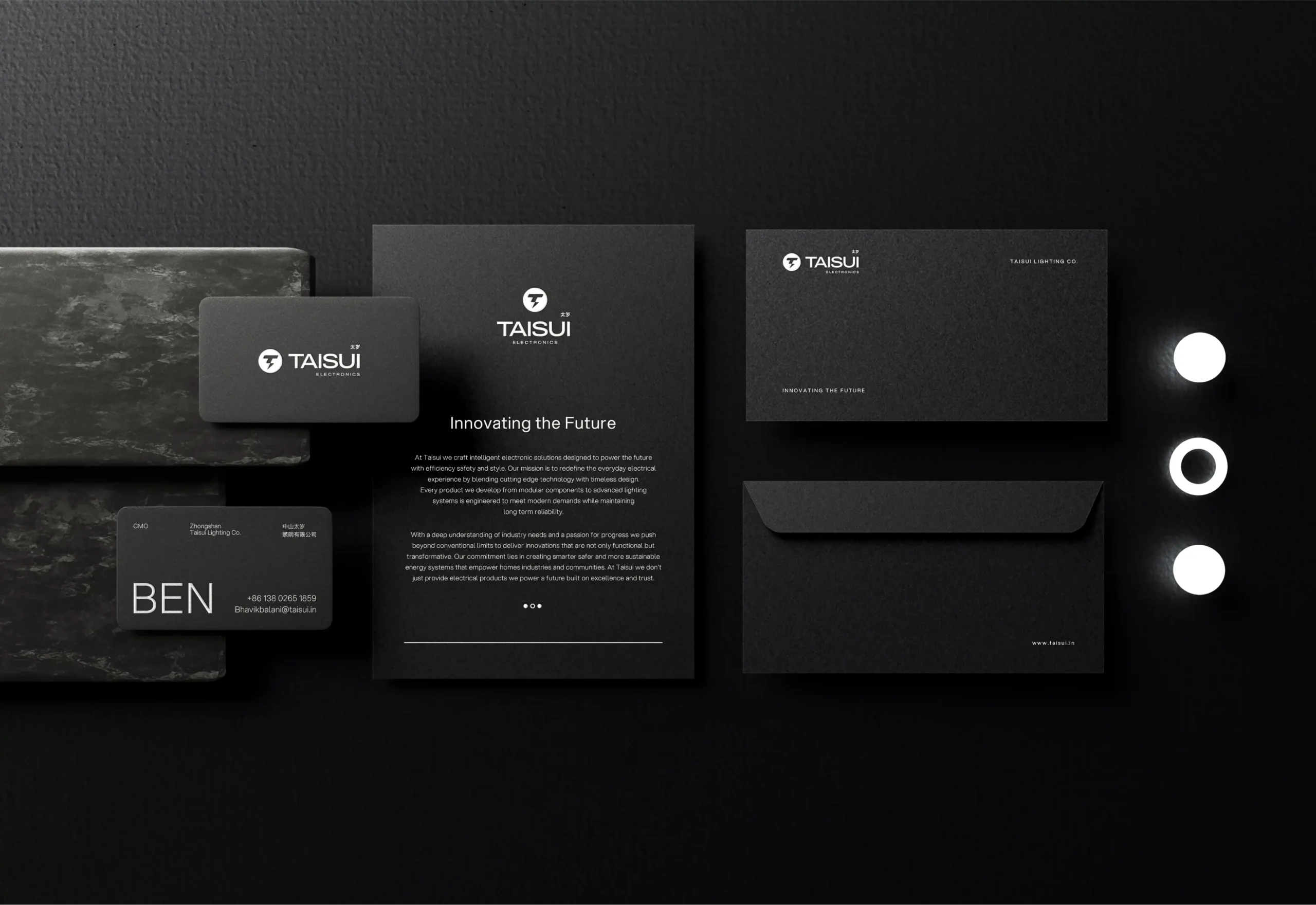 Product packaging, corporate stationery, and digital interfaces were developed with precision and purpose. From matte black textures to spacious, modular layouts, each element reinforces Taisui’s promise of quality and intelligence. The unified design system creates a consistent experience, whether users are handling physical products or engaging online.